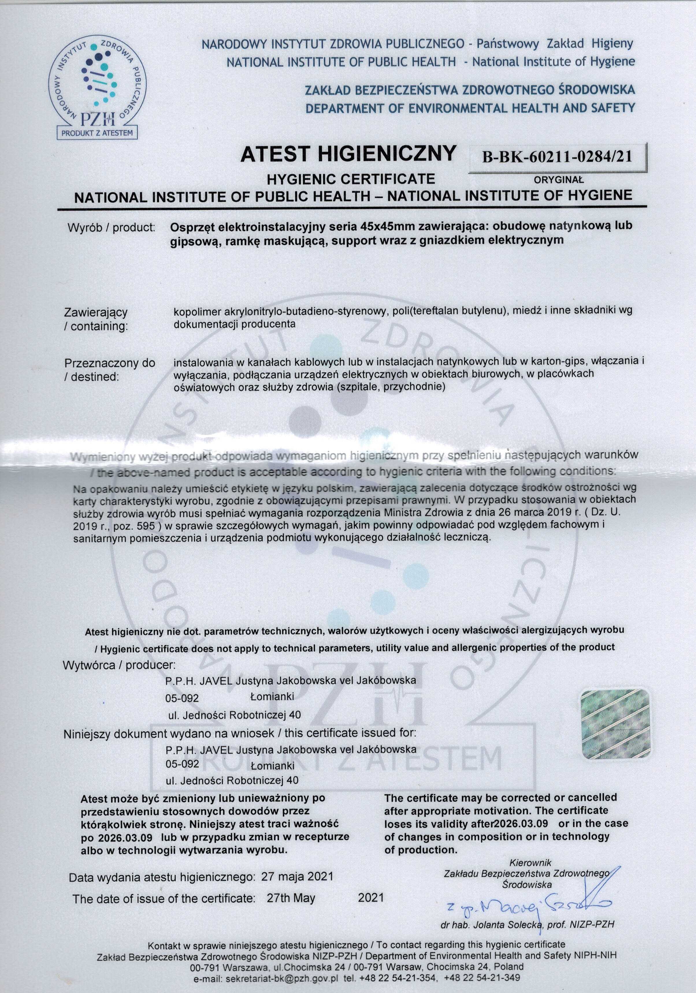 Nasz system osprzętu elektroinstalacyjnego 45x45mm JAVEL posiada atest PZH. Ten certyfikat ułatwia proces decyzyjny oraz spełnia rygorystyczne wymagania dokumentowe, stosowane podczas przetargów czy procesów wyboru dostawcy.